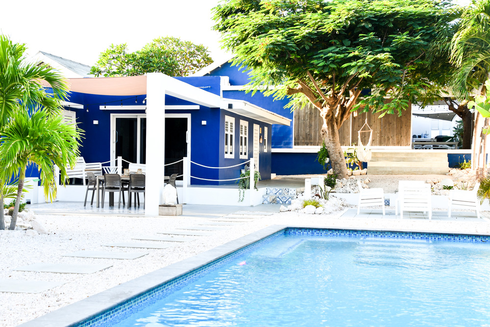 House TRES biedt ook een prachtig terras direct aan het zwembad. Het zwembad wordt slechts gedeeld met de gasten van Studio Ocho, waardoor je altijd kunt genieten van rust en ruimte. Op het tuinstrand, gelegen onder een grote schaduwrijke boom, staan ligstoelen voor je klaar, zodat je zowel van de zon als van de schaduw kunt genieten. Voor ultieme ontspanning zijn er ook hangmatten en een hangstoel om heerlijk in weg te dromen.